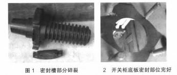 10kV高壓充氣柜運轉(zhuǎn)一段時間后,低氣壓報警發(fā)起,斷路器氣室壓力下降,經(jīng)SF氣體檢漏儀檢測為穿墻套管部分漏氣,拆開穿墻套管后發(fā)現(xiàn)密封槽部分碎裂,如圖1所示,開關(guān)柜底板密封部位完好,如圖2所示。