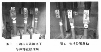 穿墻套管下部為出線,與電纜銅搭子導(dǎo)體部直接聯(lián)接,如圖5所示。撤除聯(lián)接螺栓后產(chǎn)生聯(lián)接方位移動,如圖6所示。此現(xiàn)象說明電纜銅搭子與穿墻套管存在很大的聯(lián)接變形,并產(chǎn)生應(yīng)力,在電纜通電后產(chǎn)生的電動力和聯(lián)接應(yīng)力進一步效果于穿墻套管,使得穿墻套管產(chǎn)生碎裂。