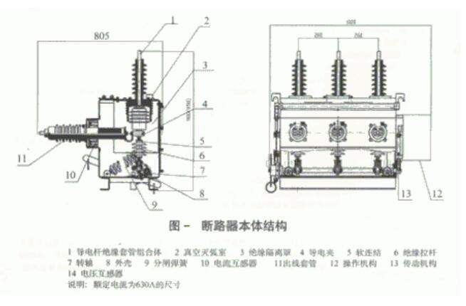 斷路器本體部分由導電回路,絕緣系統(tǒng),密封件和殼體組成。整體結構為三相共箱式。其間導電回路由進出線導電桿,進出線絕緣支座,導電夾,軟聯(lián)接與真空滅弧室聯(lián)接而成。