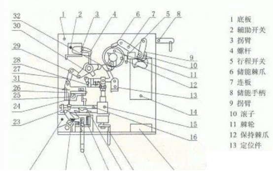 此安排為電動儲能,電動分合閘,一起具有手動功用。整個結構由合閘彈簧,儲能系統(tǒng),過流脫扣器,分合閘線圈,手動分合閘系統(tǒng),輔佐開關,儲能指示等部件組成。